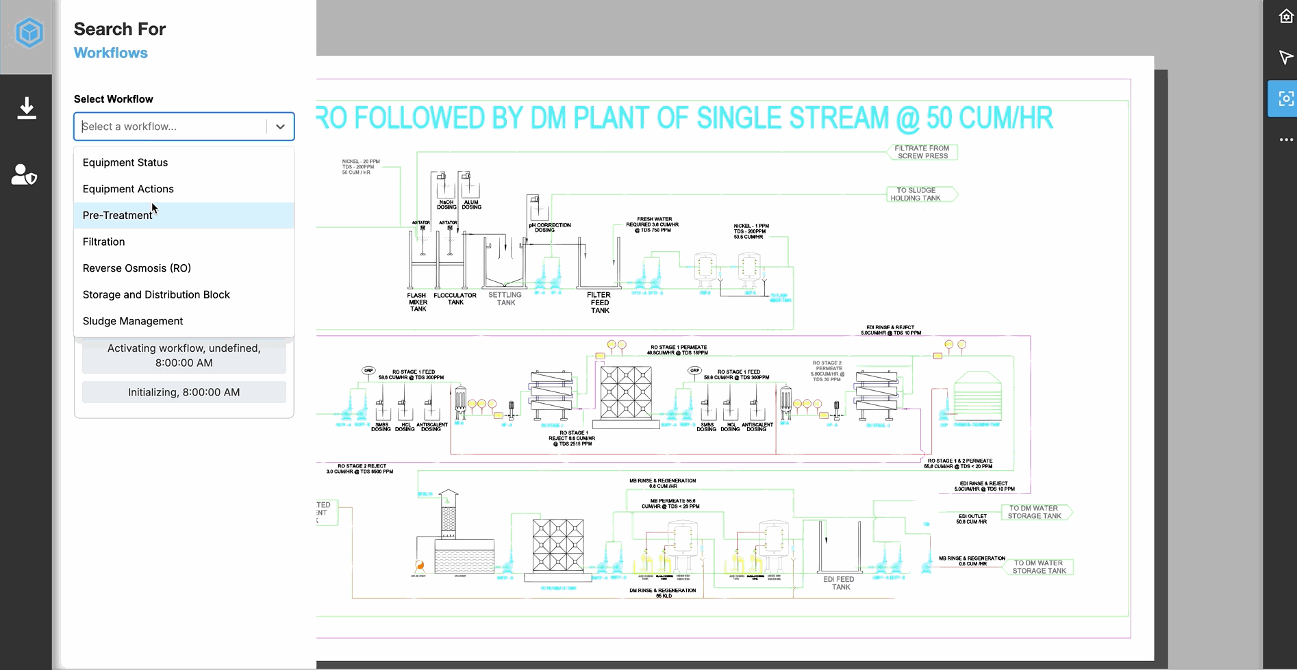 workflow: {  active: undefined,  list: [    //workflow 1    {      uuid: 1,      timeInSeconds: 4.5      loop: true,      script: [        //animation script that adds a gif to a model element        {          uuid: 'WaterSoftnerTank.293.1.Sprite',          elementIds: [293],          type: "Sprite",          frames: [              {                  type: "Gif", h                    size: 1,                  image: "/reference/invicara/sprites/p-n-id/Water_Softener_Tank/Water_Softener_Tank.gif",                  alignment: "Center",                  autoScale: true,                  blend: 0.1              }          ]        },           //animation script that adds a Leader Note to a model element           {          uuid: 20,          elementIds: [303],          type: "Markup",          frames: [            {              type: "LeaderNote",              size: ,              text: "Your text here",              blend: 0.5,              status: "Success",              strokeColor: { r: 0 , g: 255 , b: 0},              fillColor: { r: 0 , g: 200 , b: 0},              fillOpacity: 1.0,              shiftPercent: ,              blink: false,              alignment: "Center",            }          ]        },         //animation that adds a circle shape         {          uuid: 21,          elementIds: [303],          type: "Markup",          frames: [              {                type: "Circle",                blink: false,                blend: 0.8,                scale: 1,                strokeColor: { r: 0 , g: 0 , b: 0},                fillColor: { r: 100 , g: 150 , b: 255},                fillOpacity: 0.5              }          ]        },       ]    },    //workflow 2    {      uuid: 2,       timeInSeconds: 4.5,      loop: true,      script: [        //animation script that moves a truck model element to the right        {          uuid: 'wf-3.translate.sludge.truck.add.frame.302',          elementIds: [302],          type: "Translation",          frames: [            {x: 0, y: 0, z: 0},            {x: 200, y: 0, z: 0}          ],        },        //animation script that makes a model element more transparent        {          uuid: 25,          elementIds: [286],          type: "Opacity",          frames: [            0.5          ]        },        //animation script that rotates a model element six times        {          uuid: 26,          elementIds: [298],          type: "Rotation",          frames: Array.from({length: 36}, (_, i) => ({x: 0, y: 0, z: (i + 1) * 60}))        },      ]    },  ]}