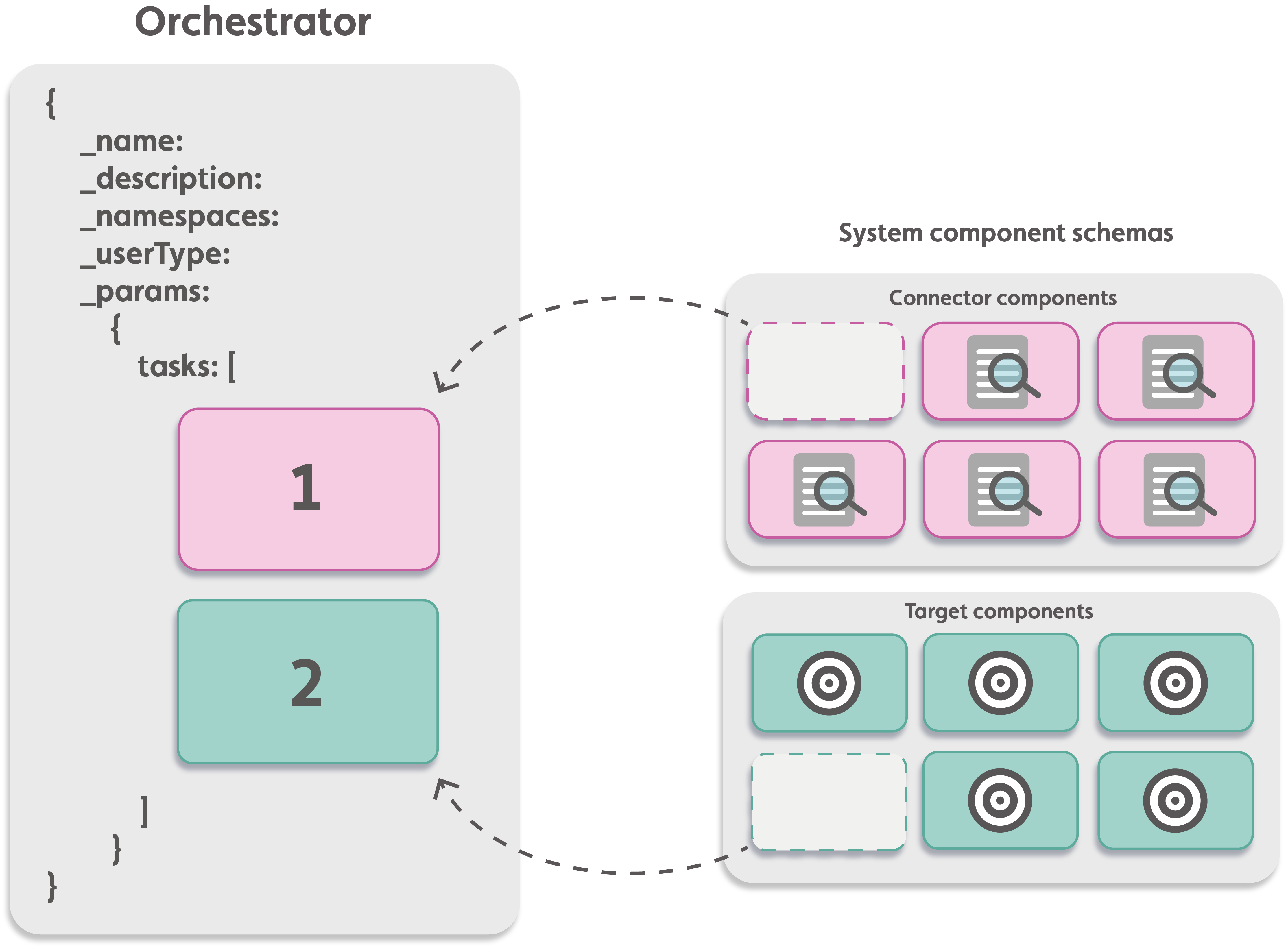Orchestrators are a configuration of sequenced system components that define a data pipeline that you can run and schedule. You can define your orchestrator to pass parameters to a component, execute that component, and pass the data to the next component.