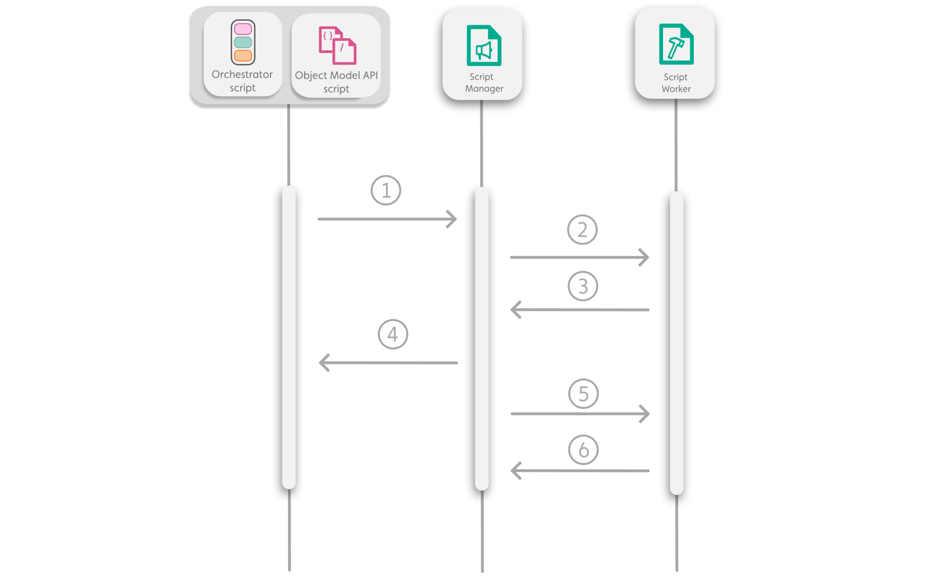 Object Model API or orchestrator script executions are managed by a script manager and executed by a script worker. With an orchestrator or an Object Model API script execution request, the following data flow occurs: