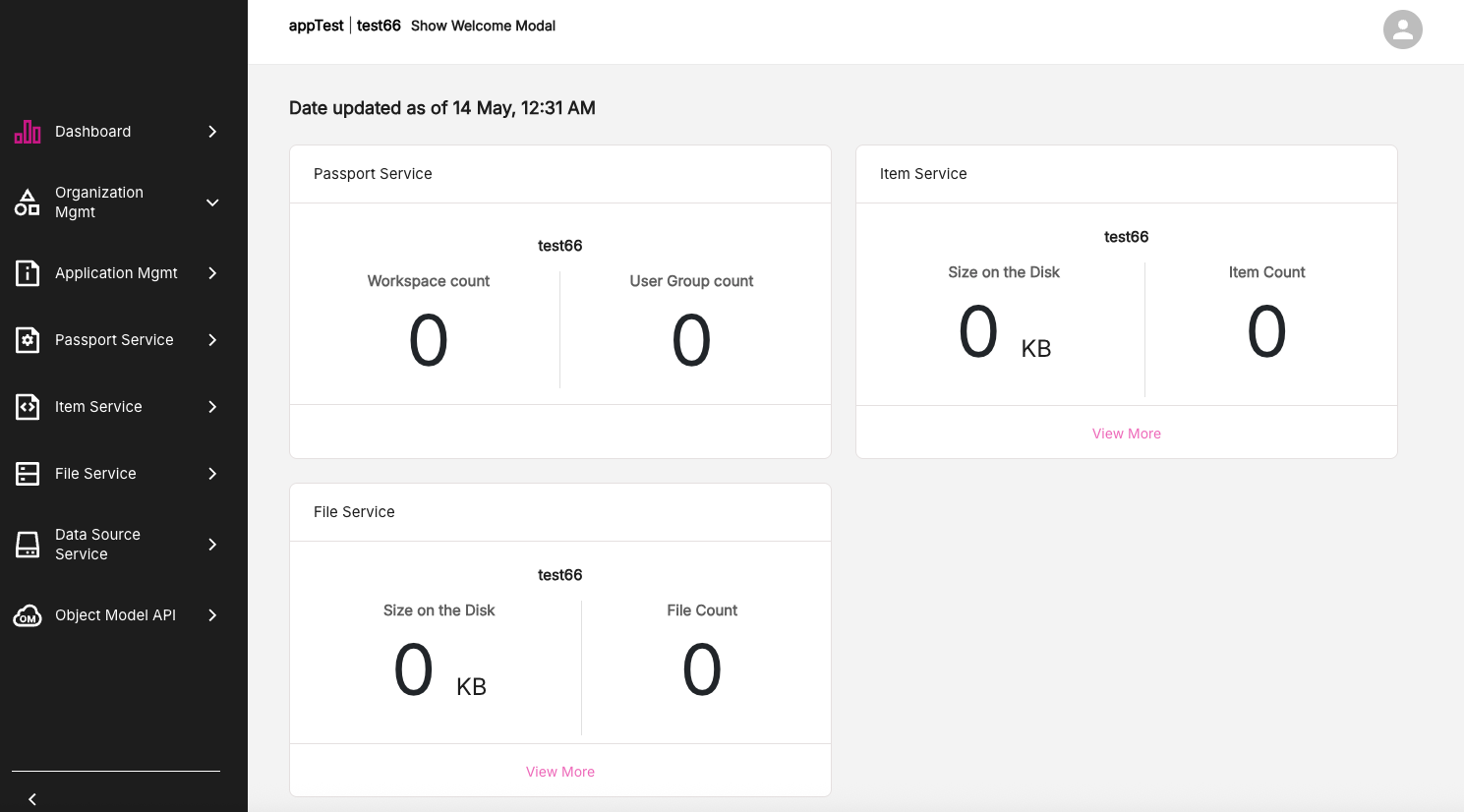 The Dashboard console presents a visual and data-driven overview of all of the Console App services, listing information such as Workspace count, User Group count, or Item count for each service.
