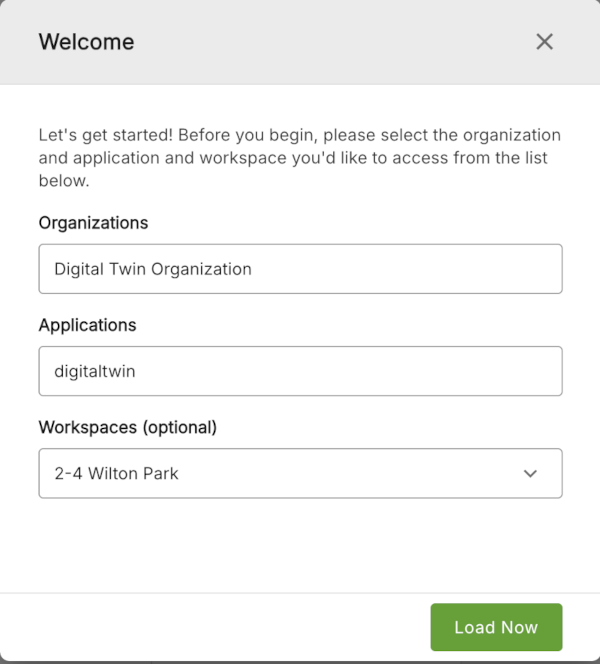 The Welcome modal will be pre-populated with information based on your previous session and the organization you have selected. Click the Load Now button to load up the organization that you have selected.