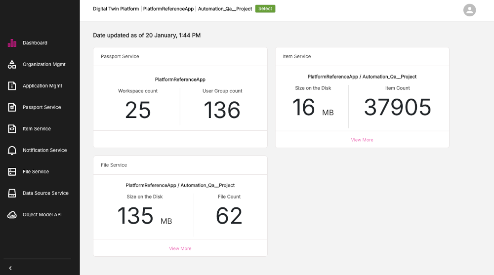 The Dashboard console presents a visual and data-driven overview of all of the Console App services, listing information such as Workspace count, User Group count, or Item count for each service.