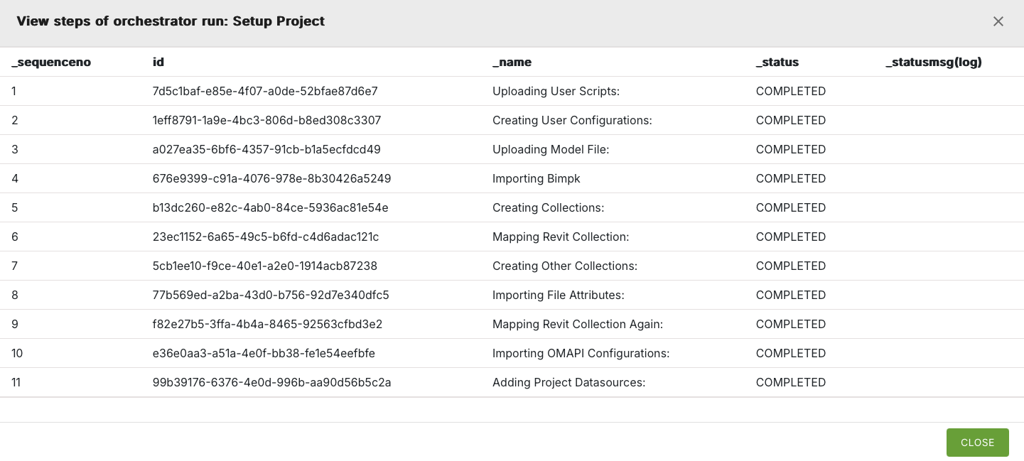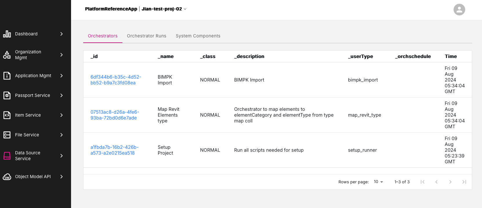 The Orchestrators tab presents a list of platform orchestrators and list the times that the operations were run. In the _id column, click on any orchestrator run entry marked in blue, to drill-down and view more detailed information about that particular orchestrator run. This information will appear in the Current Orchestrator Run page.