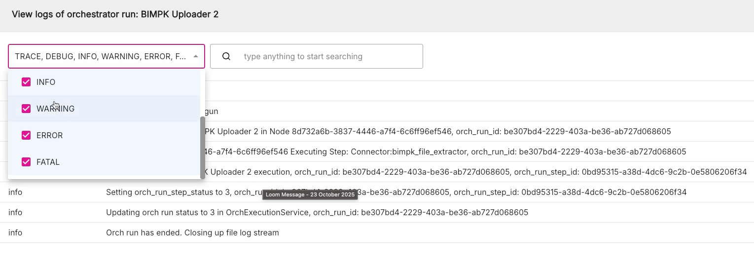 - Filter using client-side filtering - In the text box on the right, enter text for a search term or partial search term for client-side filtering of orchestrator runs. This is useful for searching through log messages for key terms.