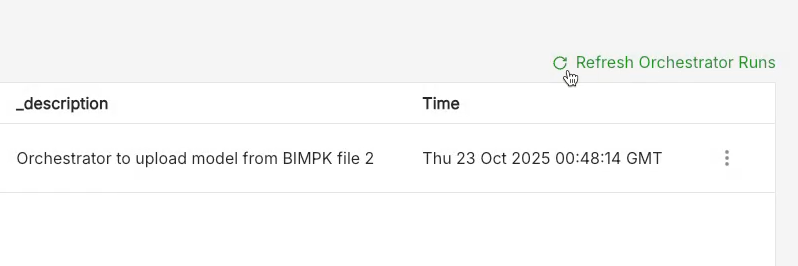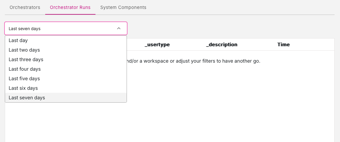 This tab presents a list of the orchrestrator runs in the workspace. If you do not see any entries on this page then try adjusting the time period by selecting different time ranges using the down-menu near the top of the tab. You can view orchestor runs from the previous seven days.
