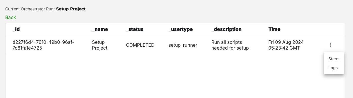 Click the Steps option to view the steps involved in a particular orchestrator run.