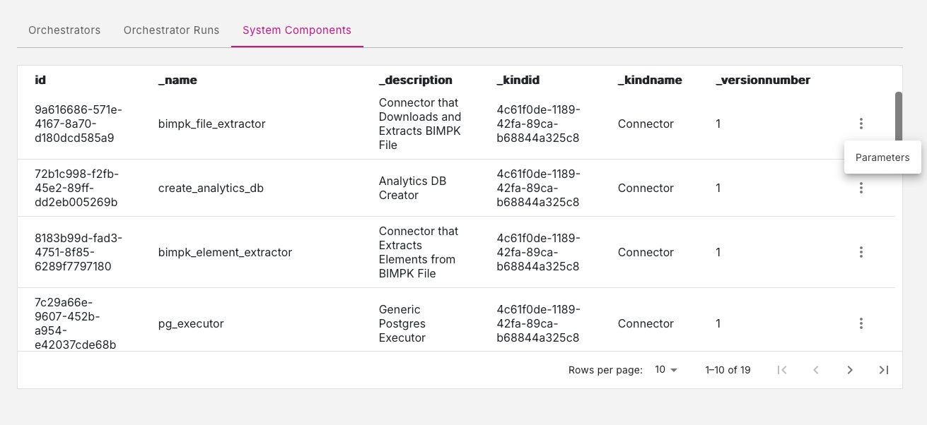 Each system component entry has a three-dot menu icon. Click this icon to reveal one option: Parameters.