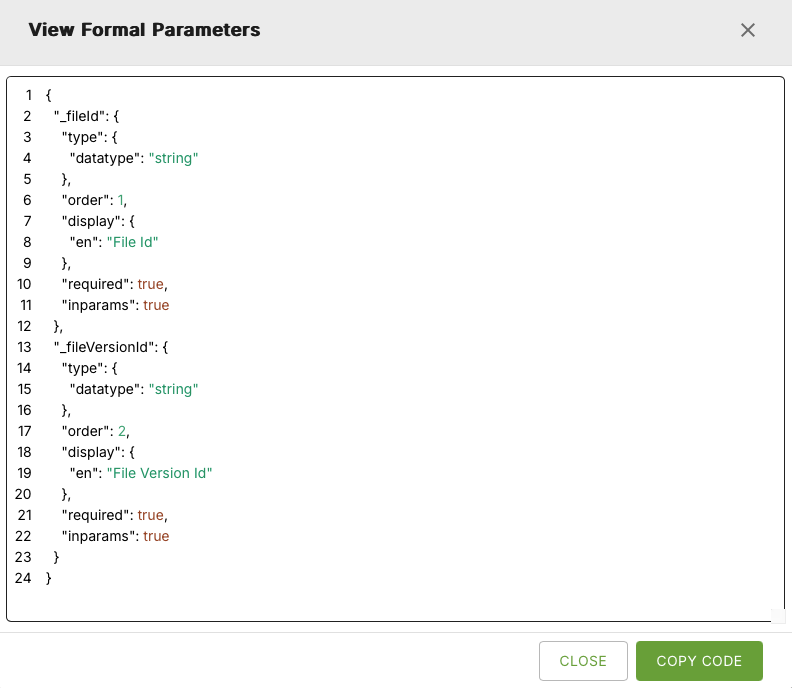 This will present you with a list of the formal parameters used for a particular system component. Use the Copy Code button to easily copy the list of parameters.