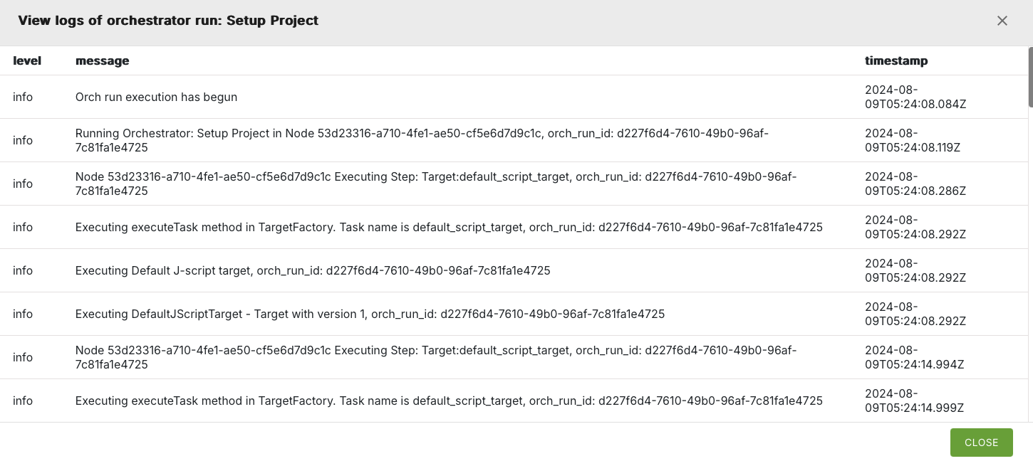 Click the Logs option to view the system logs for a particular orchestrator run.
