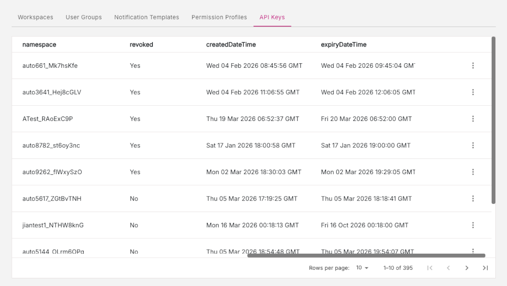 The API Keys tab is for Platform Managers and facilitates API key management. The API Keys tab lists all the API keys which are managed by a Platform Manager.