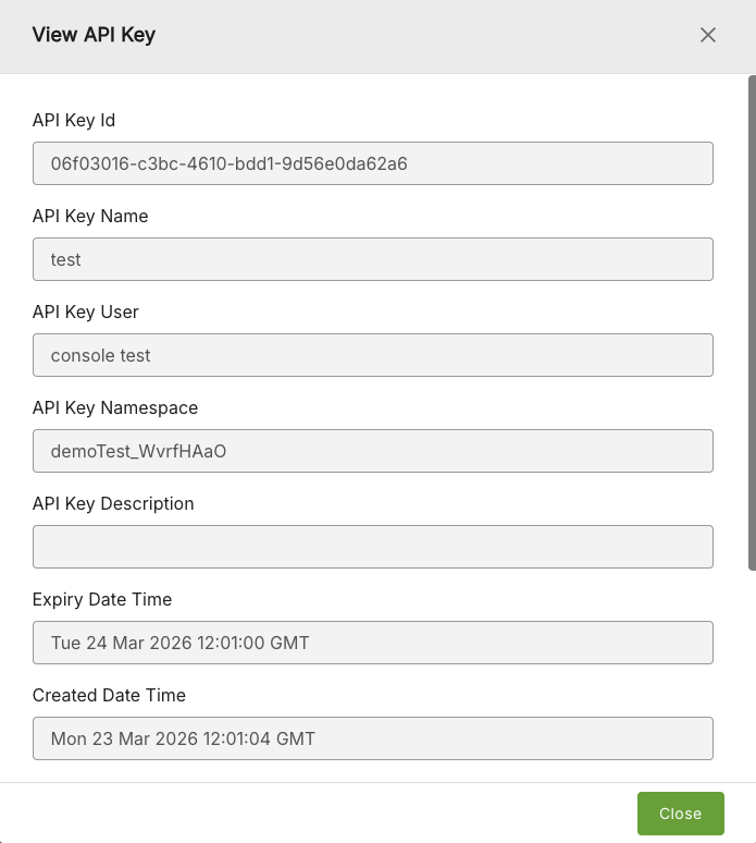 Click the View option to display the View API key window which displays all the information for a particular API key.