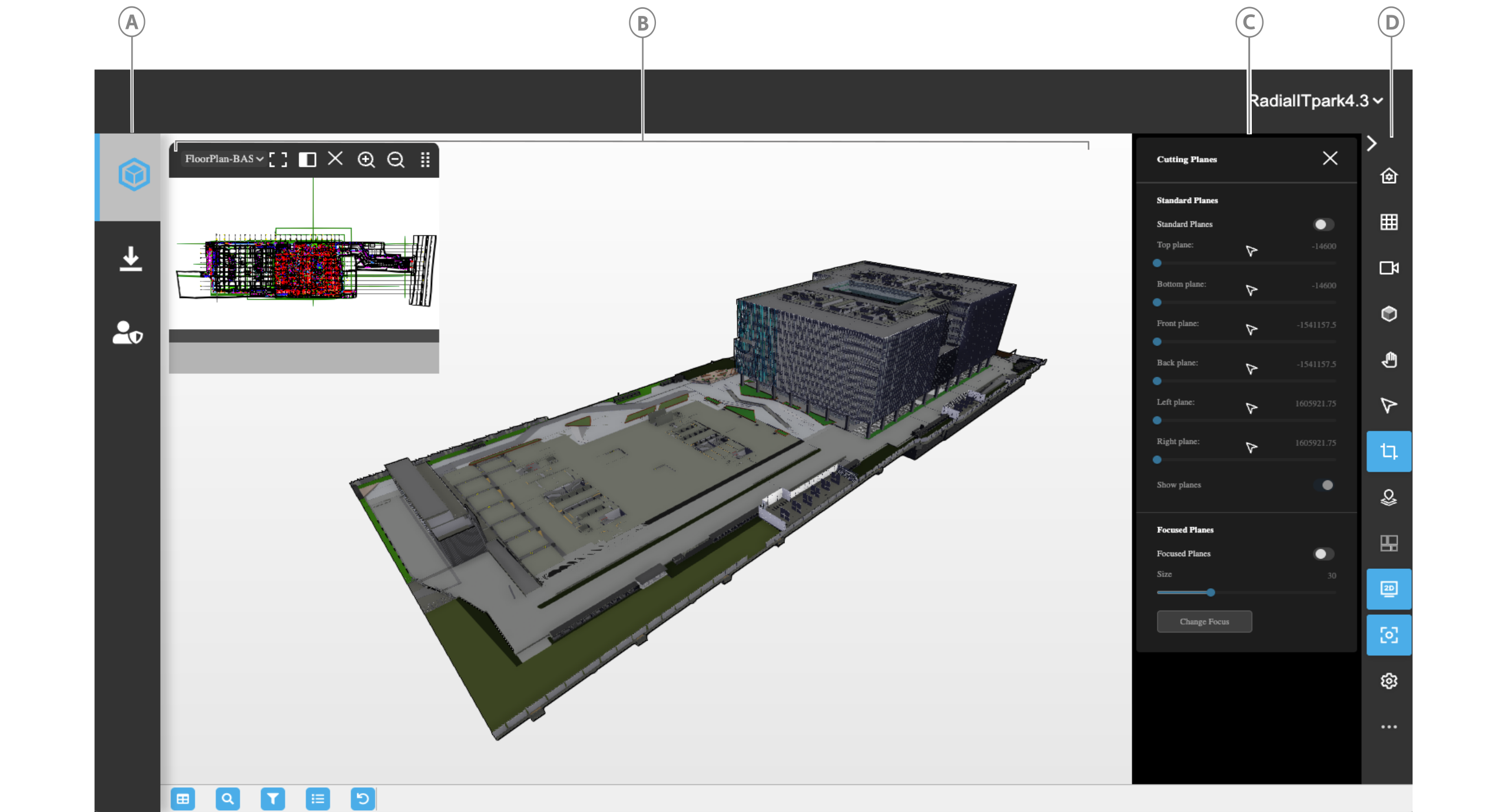 Cutting PlaneCut the model by a horizontal or vertical plane, either by coordinates or by point of mouse click. For more information, see Cutting Planes pane.