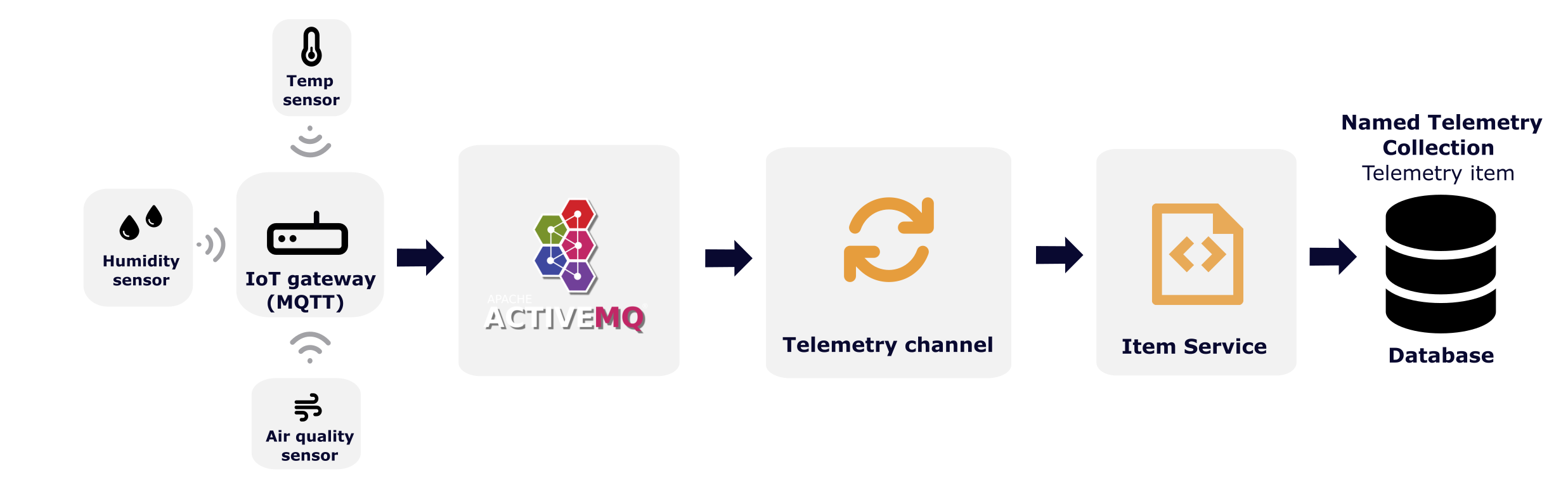 Internet of Things (IoT) integration collects data generated by IoT devices and stores that data in a database. The data is stored by the Item Service as a telemetry item in a Named Telemetry Collection.