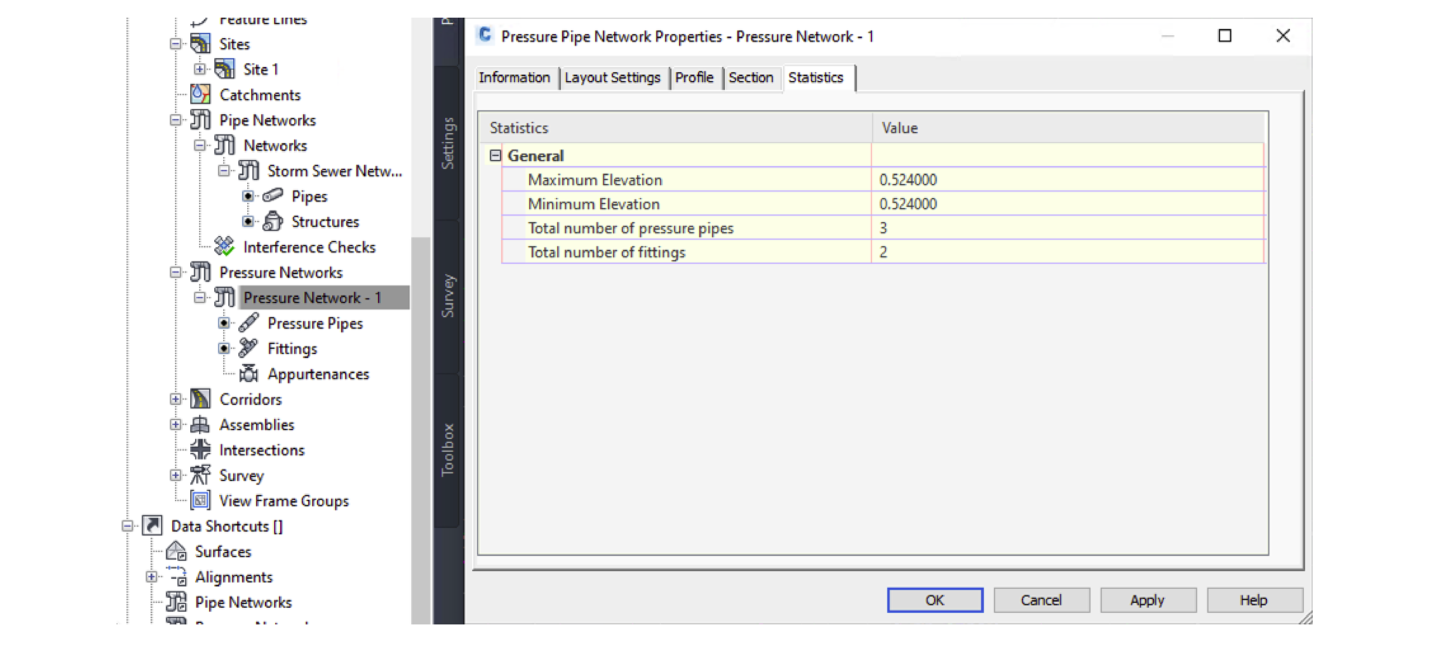 The plug-in also exports the following data in the Pressure Pipe Network Properties - Pressure Network window, on the Statistics tab: