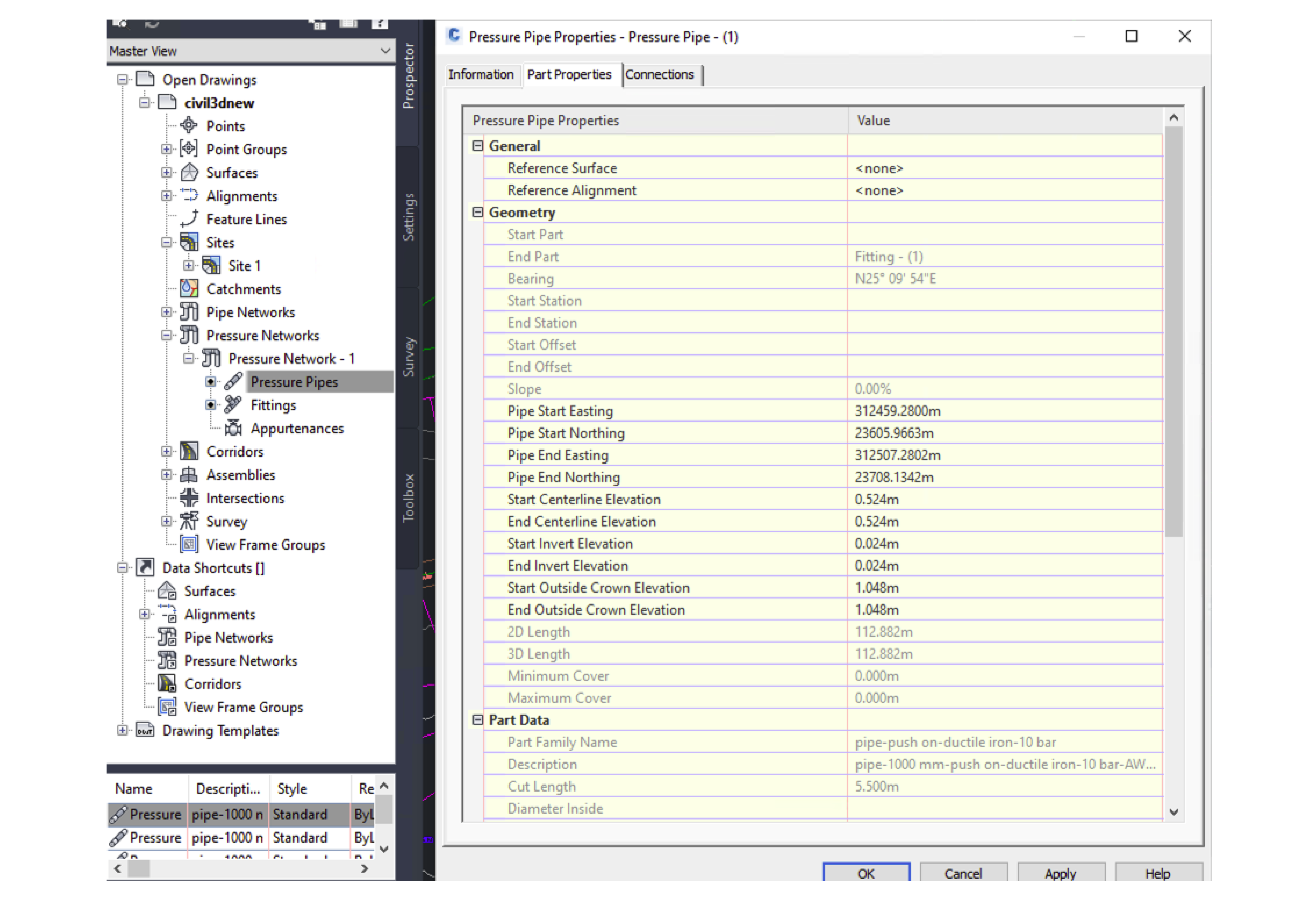 The plug-in also exports the following data in the Pressure Pipe Properties window, on the Part Properties tab:
