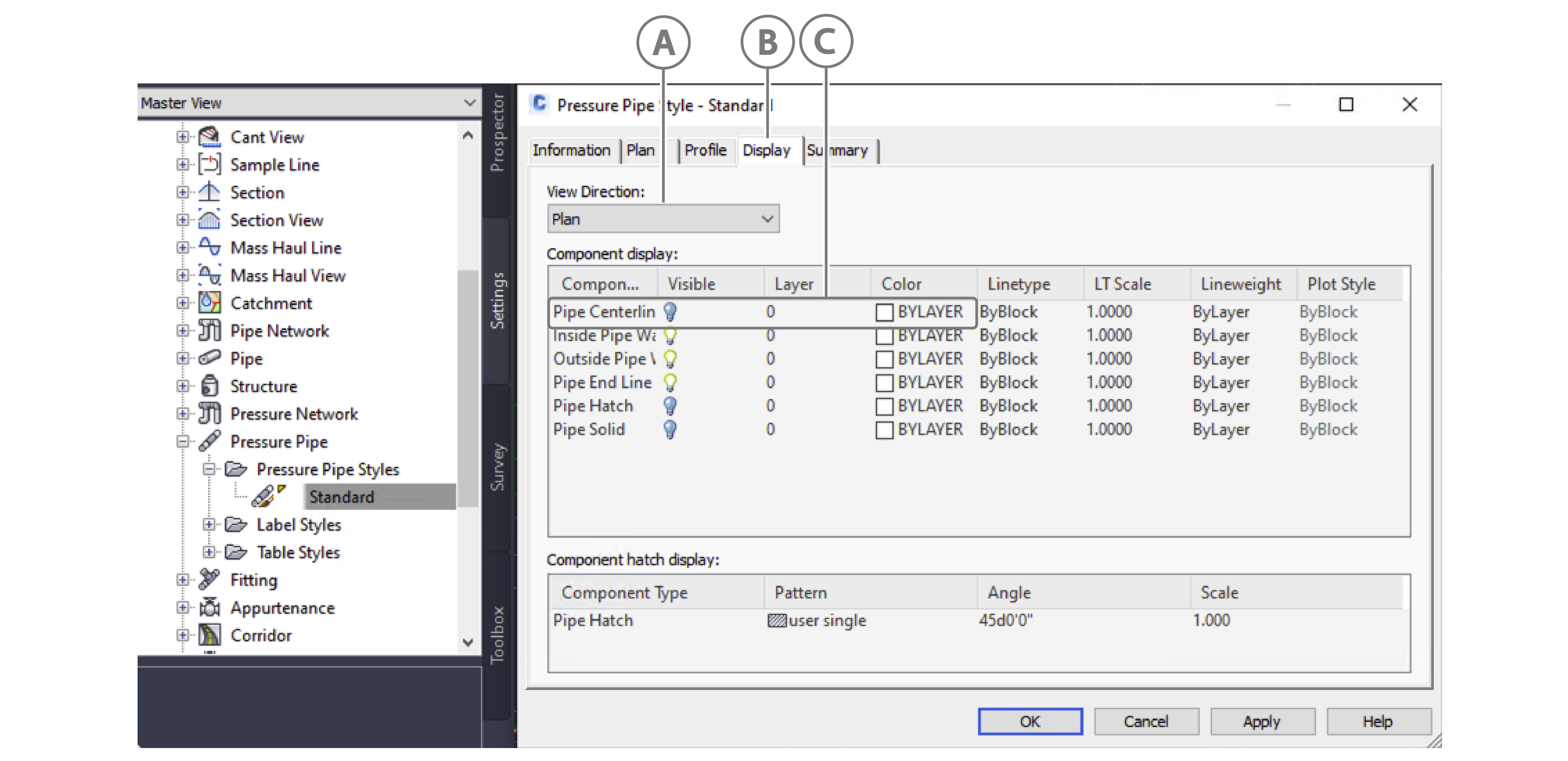 In the Pressure Pipe Style window, on the Display tab, from the View Direction drop-down, select Model.