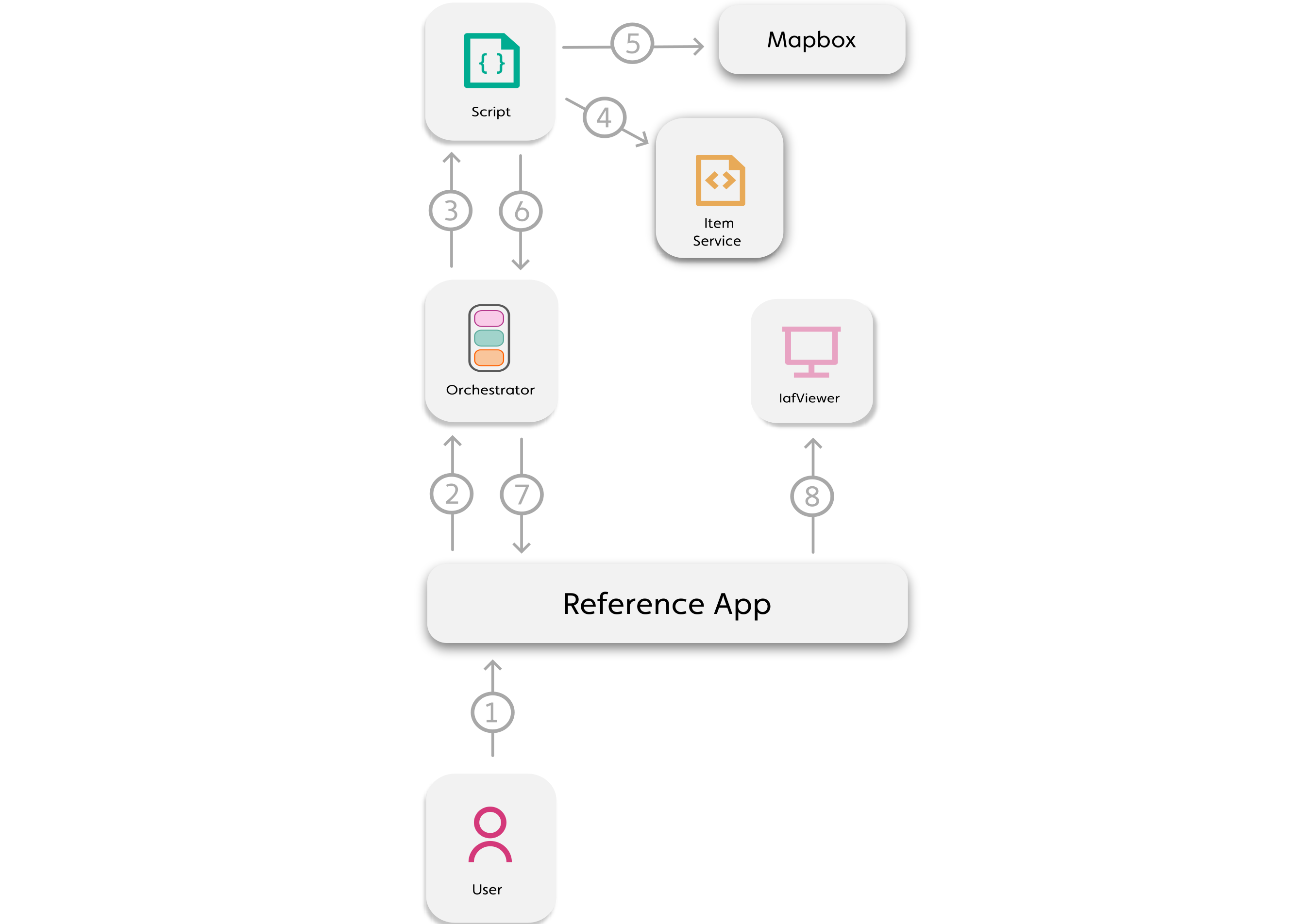 Callout Description 1 Non-admin user requests to view 3D model with Mapbox 2 Temp Mapbox token Orchestrator runs with permission profile, which permits the script read the mapbox secret from Item Service. 3 The Orchestrator runs the required script 4 The script reads the Mapbox secret from Item Service 5 The script uses the Mapbox secret to generate a temp token via the Mapbox API 6 Script returns temp token 7 Orchestrator returns temp token 8 Temp token passed to IafViewer and stored in session storage