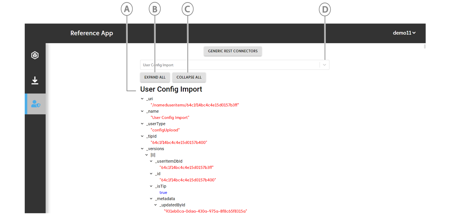Callout Name Description A Response data structure Click to open the Admin page B EXPAND ALL button Expand the data structure to view all of the data. C COLLAPSE ALL button Collapse the data structure. D Response dropdown Select the response you want to view.