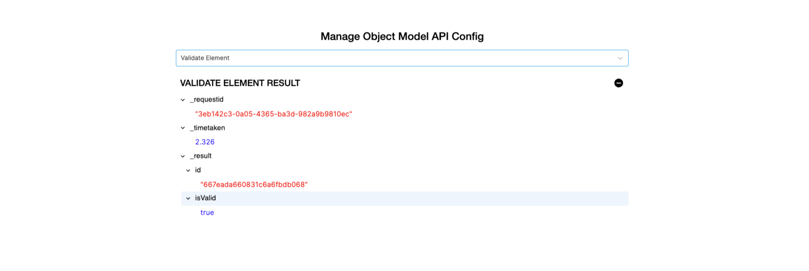 In the following example, when the user selects Validate Element from the dropdown menu, the request sends and the response displays as a tree menu that the user can expand.