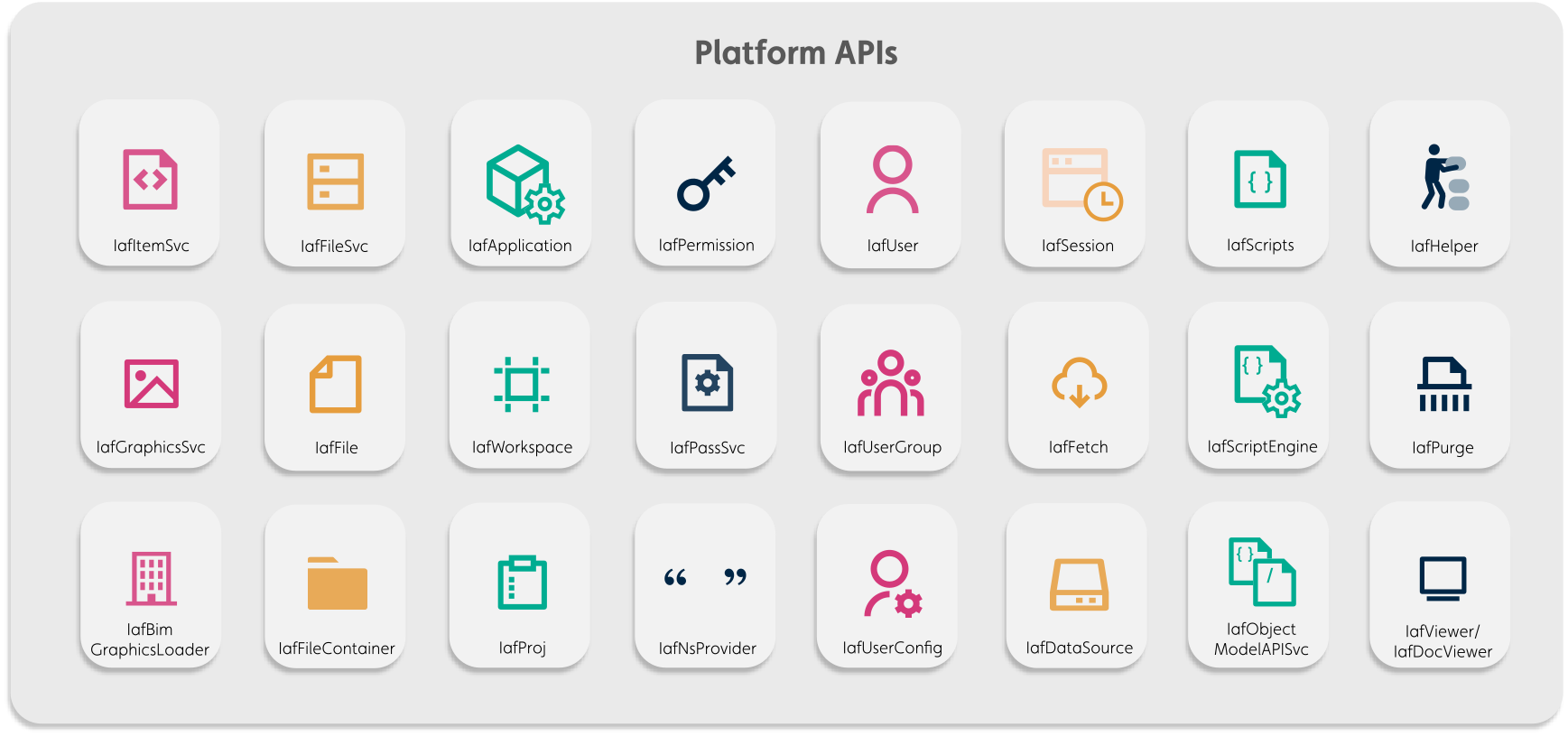 - Wrappers over Platform Services REST APIs, for example, IafPassportSvc, IafItemSvc, IafDatasourcesSvc, IafFileSvc, IafGraphicsSvc