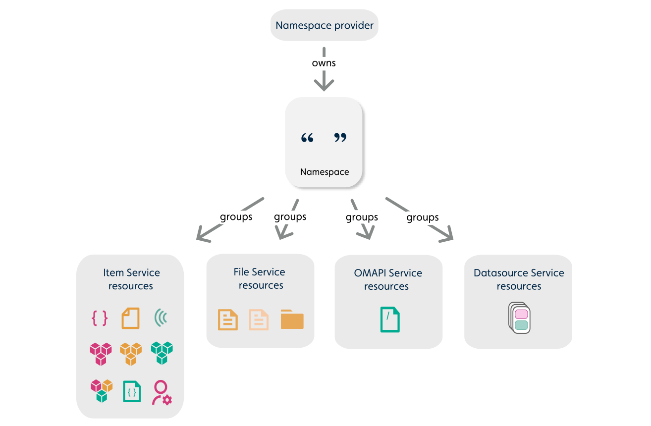 The following diagram shows the platform's namespace providers and their hierarchy. As well as owning the namespace it creates, some namespace providers can own instances of the namespace below it in the hierarchy. For more information on the UserGroup owner roles for namespace providers, see Platform roles overview.