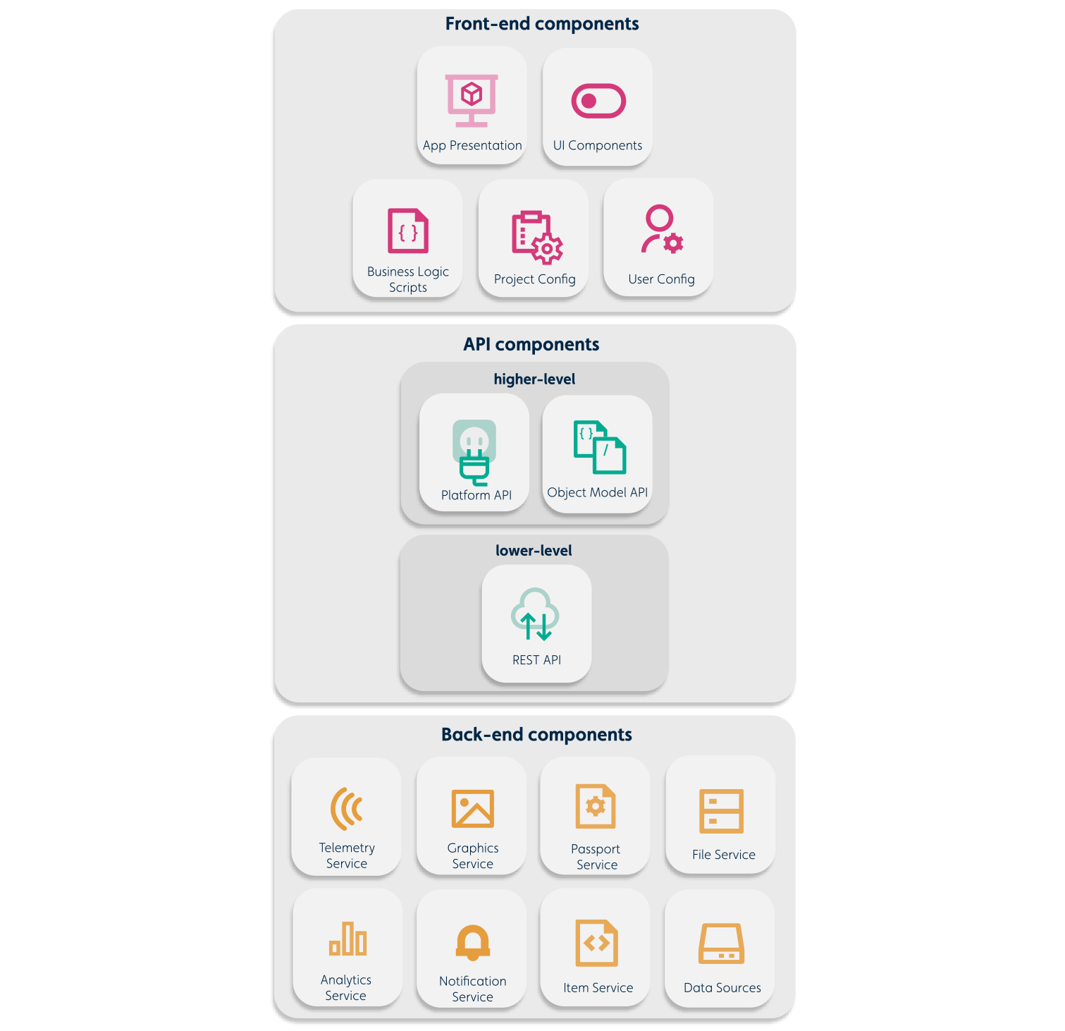 | Front-end components | Components that the user interacts with in the UI and components that developers use to write scripts to read and modify data, define project definitions, and to configure the front end experience. |
