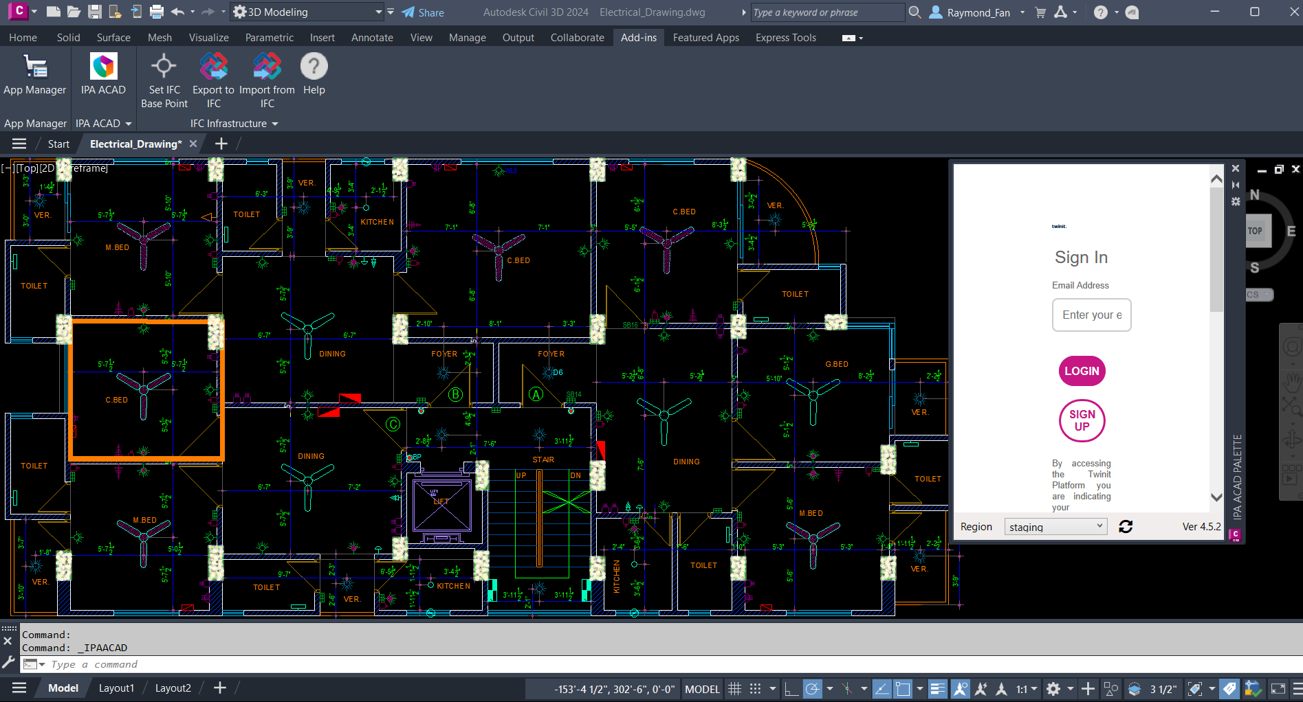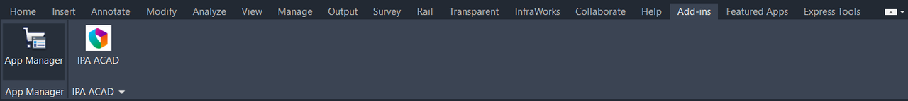 In the AutoCAD application, in the top menu ribbon, on the Add-ins tab, verify that the IPA ACAD plug-in appears in the AutoCAD ribbon. You can also launch the plug-in by entering the command: