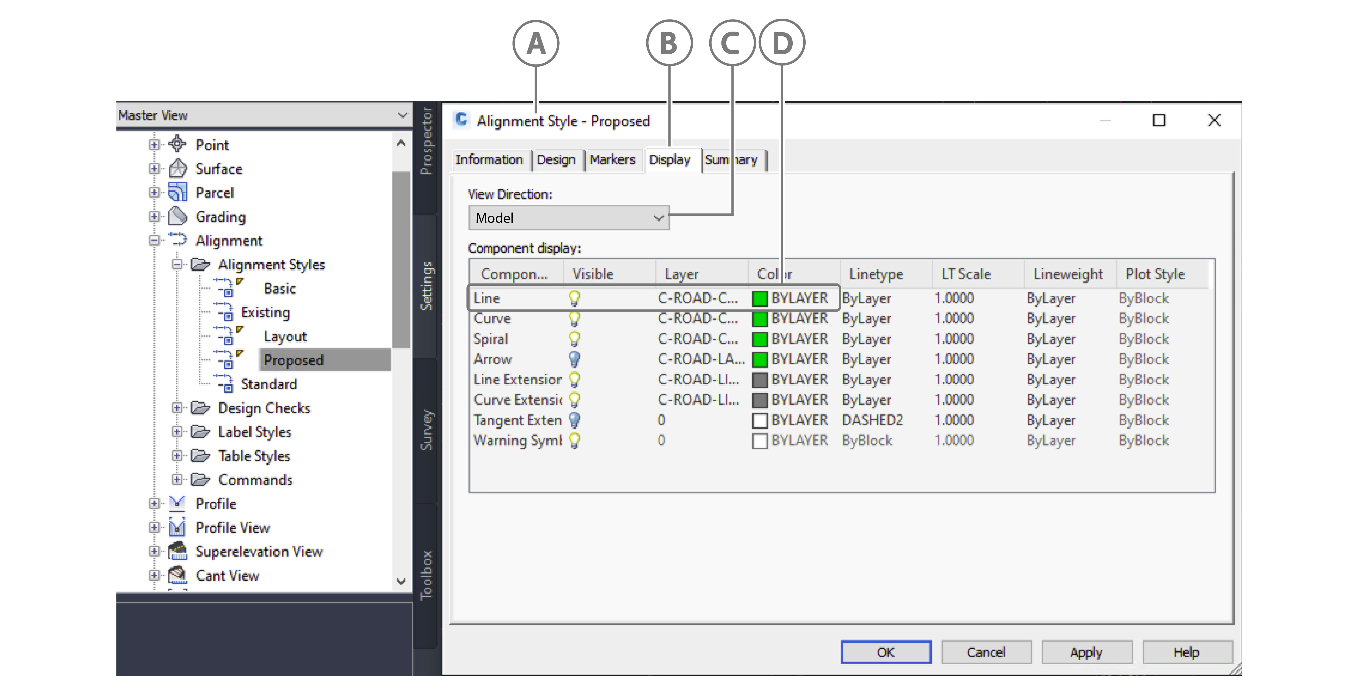 • Alignment color: On the Display tab, from the View Direction drop-down, select Model. In the Component display table, in the Color column, click the color picker.