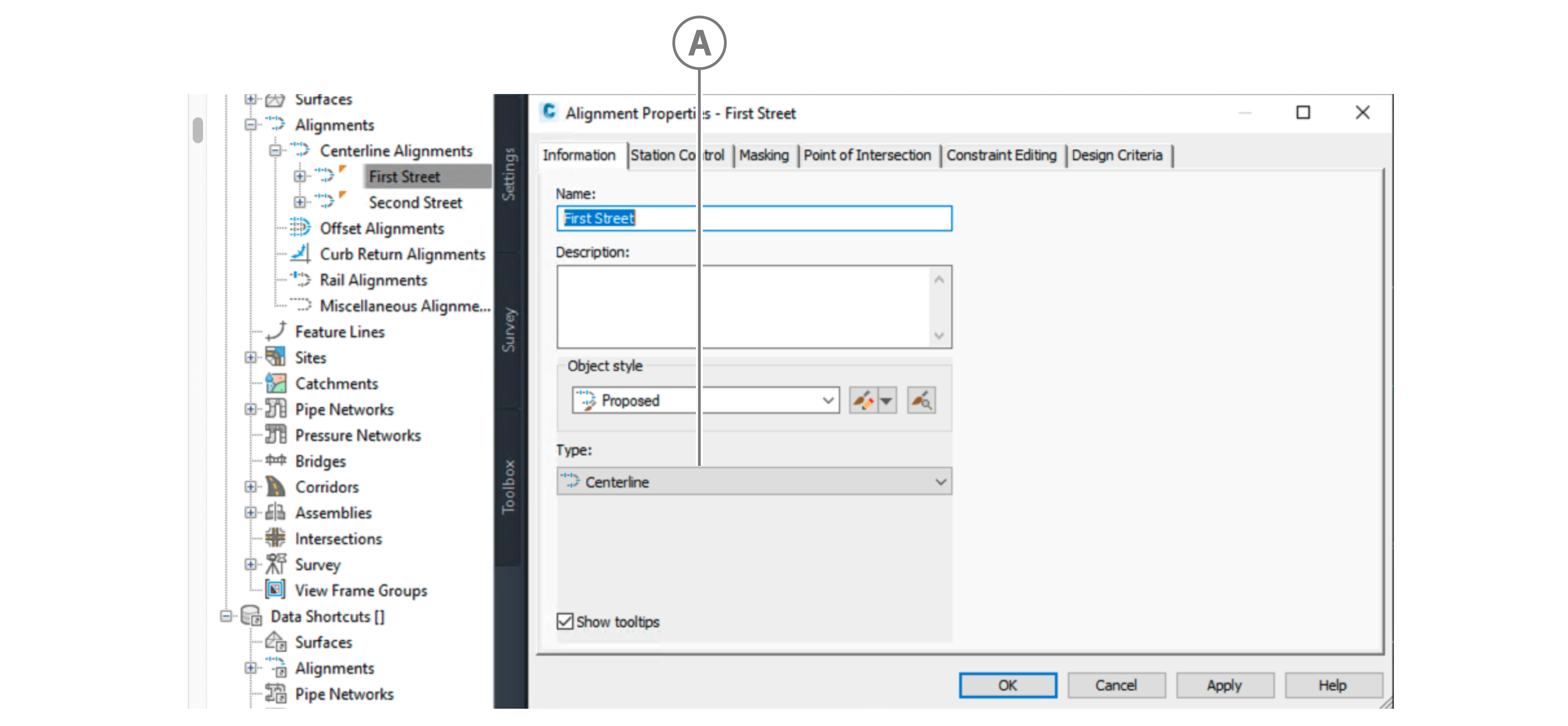 • Alignment Type: On the Information tab, from the Type drop-down menu, select either Centerline, Offset, Curb Return, Rail, Miscellaneous.