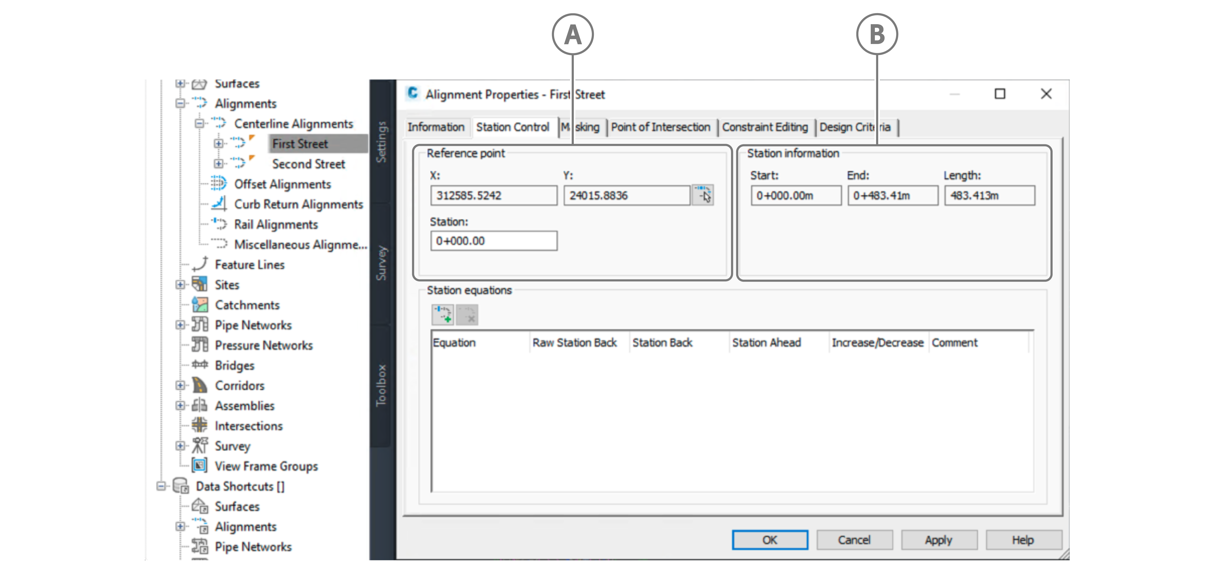 • Station reference points: On the Station Control tab, in the Reference point area, in the X and Y fields, enter X and Y values.
