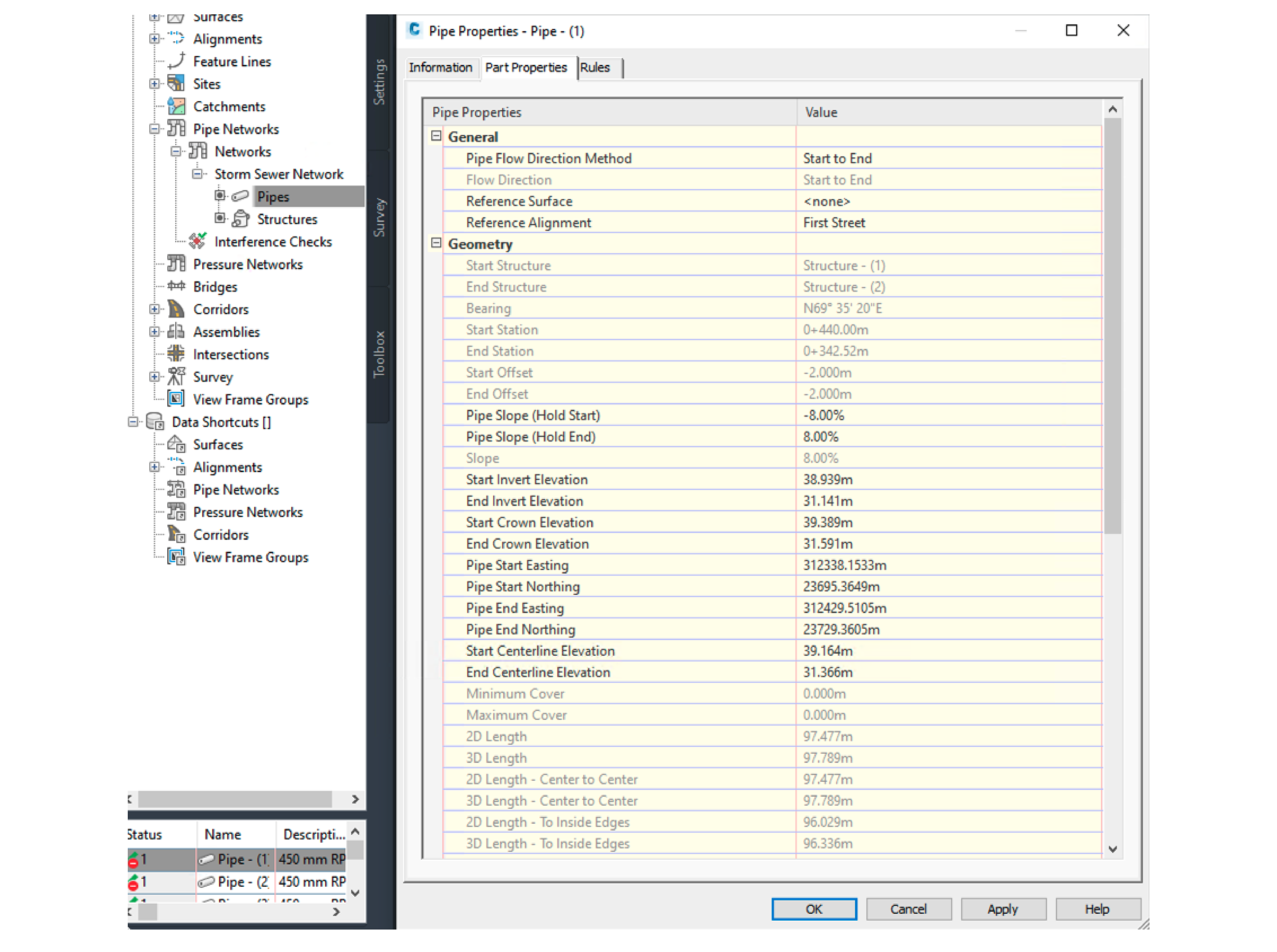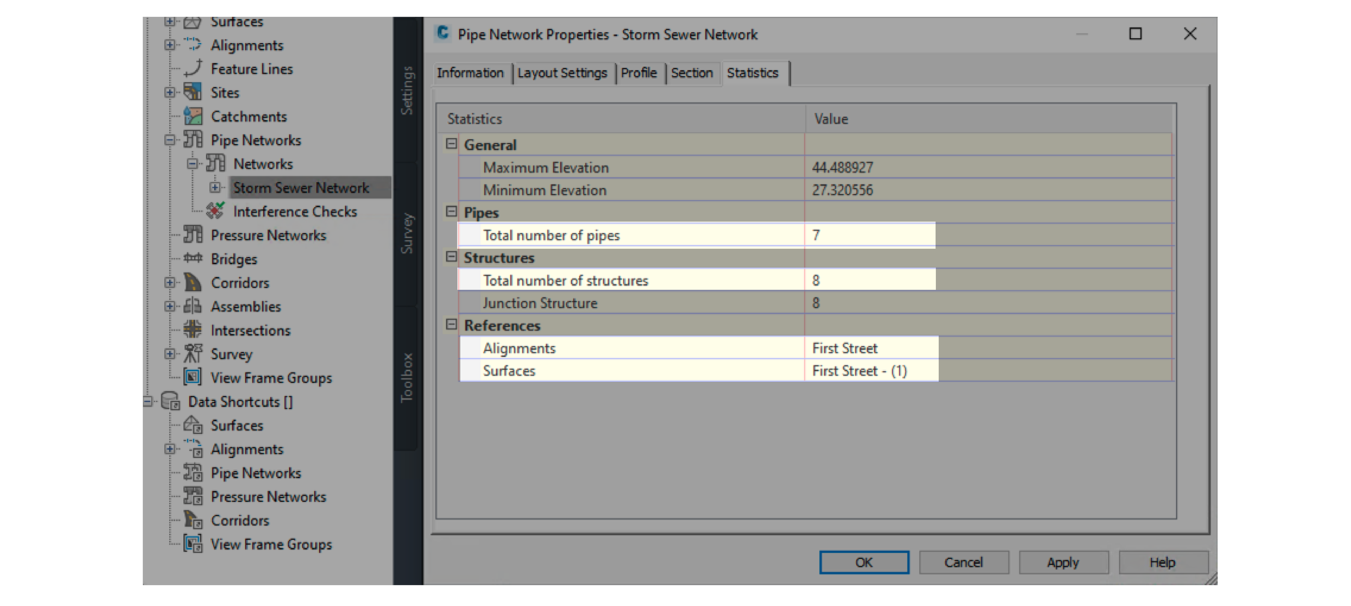 The plug-in also exports the following data in the Pipe Network Properties window, on the Statistics tab: