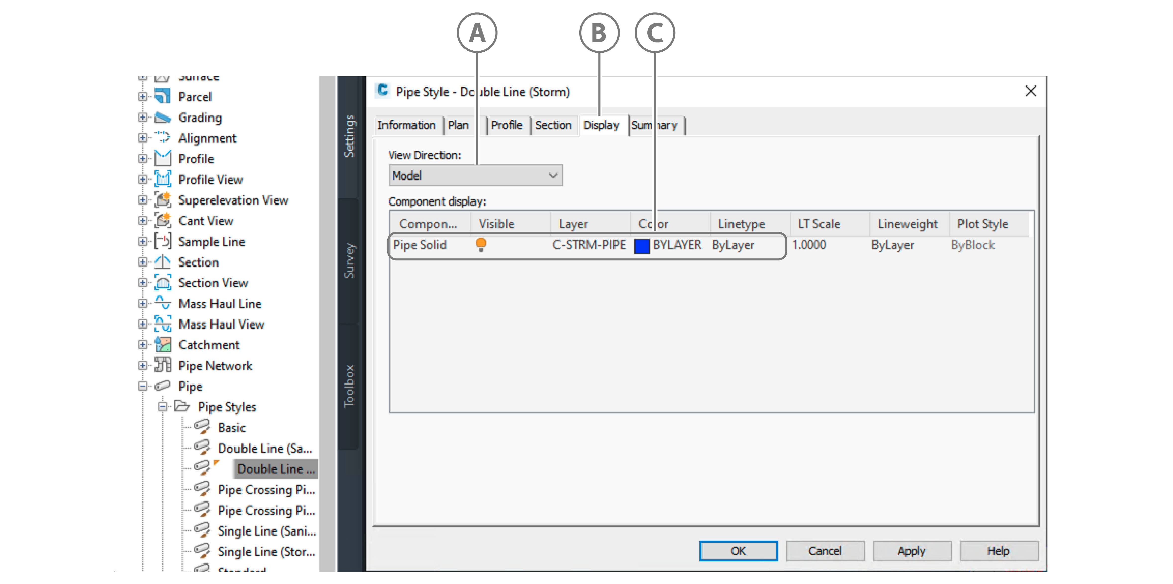In the Pipe Style window, on the Display tab, from the View Direction drop-down, select Model. In the Component display table, in the Color column, click the color picker and select a color. If the color is white, the plug-in exports the default color, blue, for visibility.