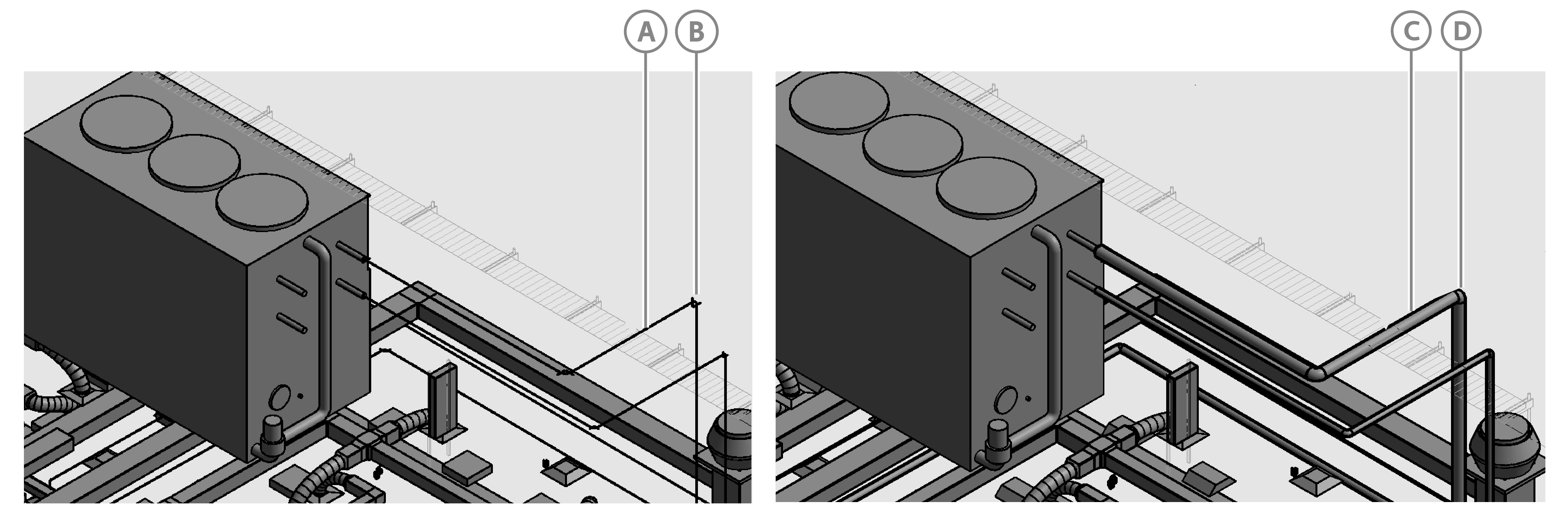 The following graphic demonstrates the Medium and Fine detail levels for pipes and pipe fittings. For the Medium level, they appear as Line geometry, and for the Fine level, they appear as solid geometry: