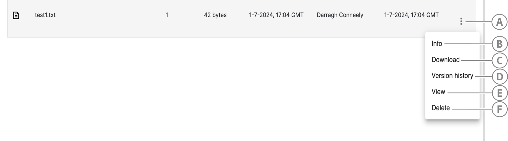 Click an item's Actions icon to view the actions available for that item, such as viewing its object properties, version history, file contents, or to download or delete the item.