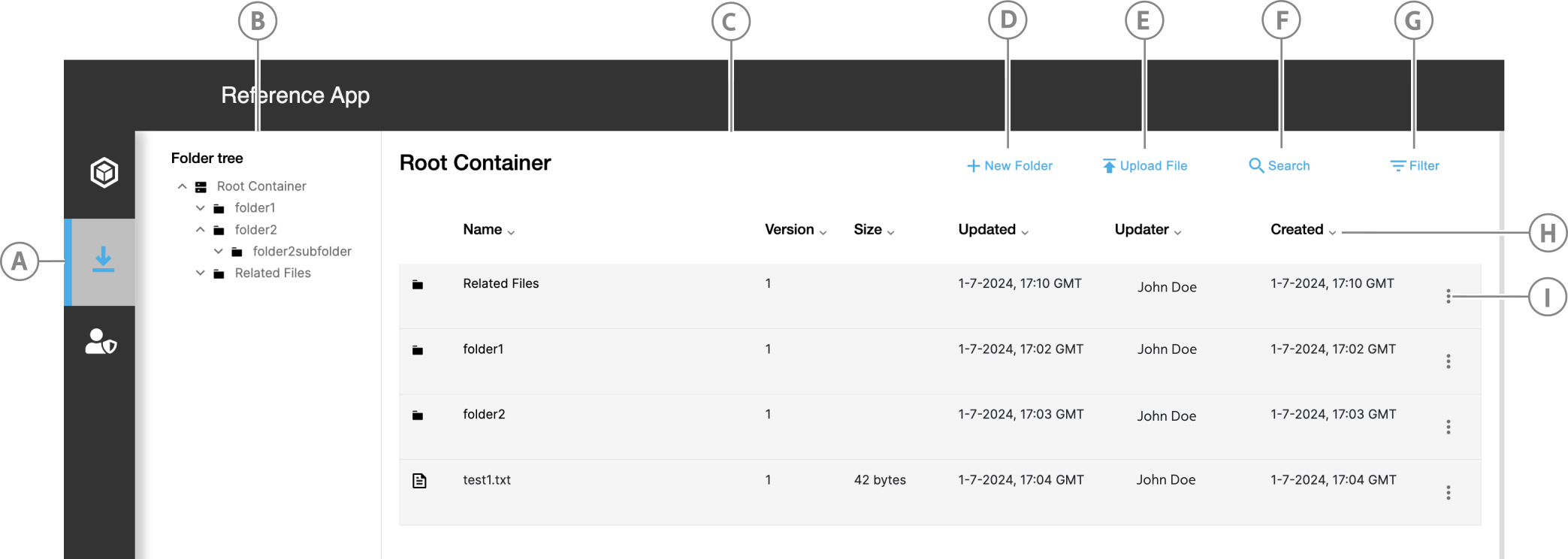 | E | Upload File button | Click to upload a new file to the current folder and post it to the database as a File and FileItem type. |