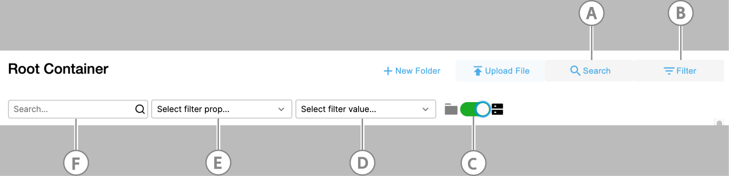 | F | Search input | The search feature uses a regex filter to instantly filter the folders and files by name as the user types. |