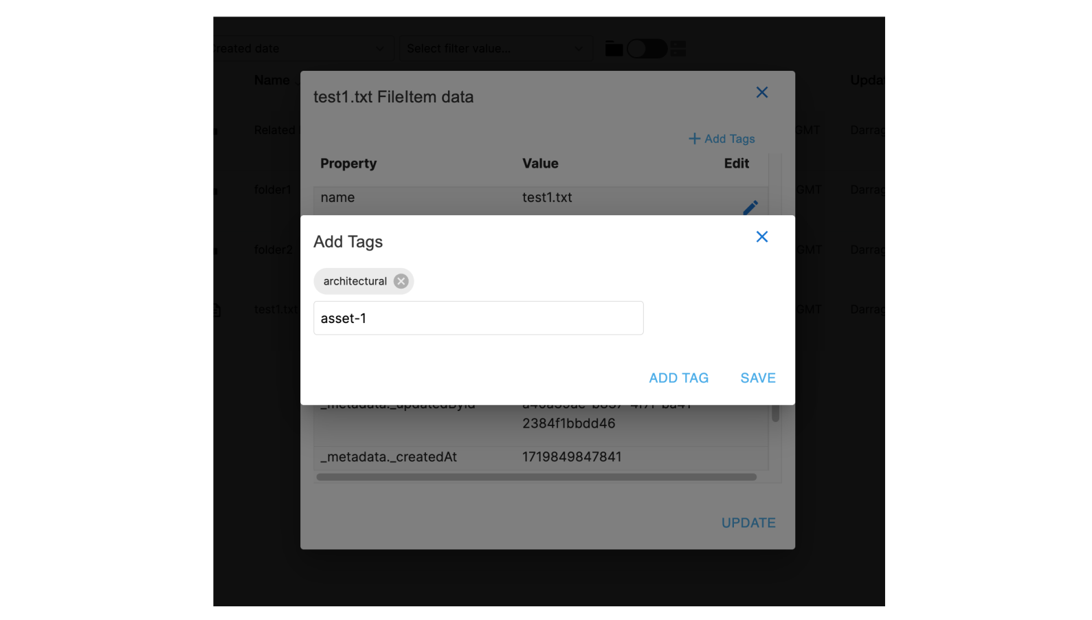 You can add or remove custom tags from a folder or file's object properties. When you save your changes, the working object updates. To update this in the database, click UPDATE.