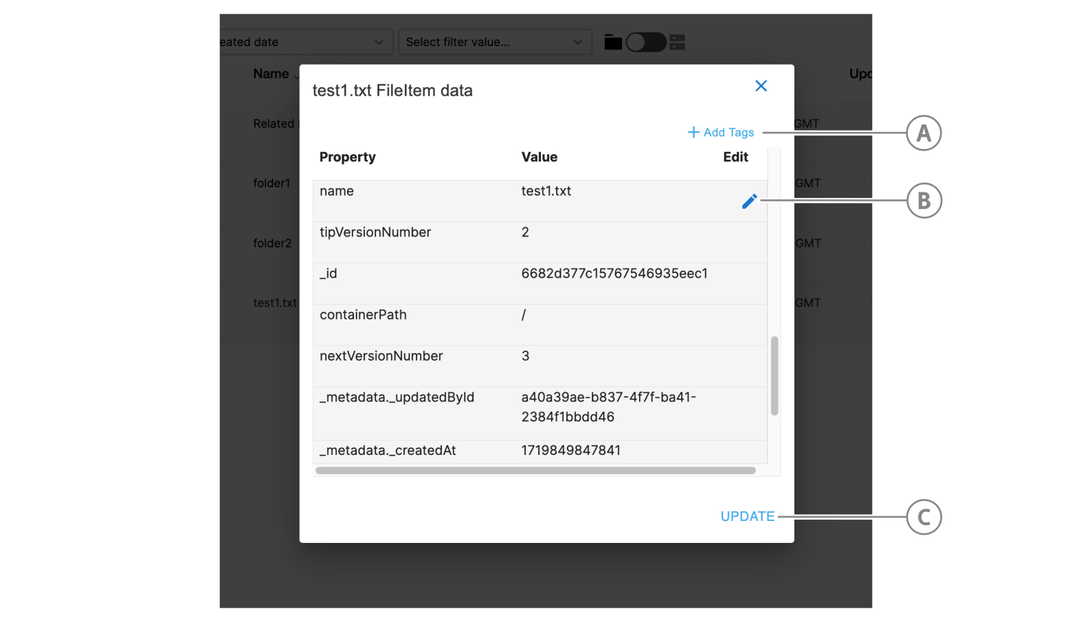 | B | Edit icon | When you view a folder or file's object properties, you can edit properties with an edit button. When you save your changes, the working object updates. To update this in the database, click UPDATE. |