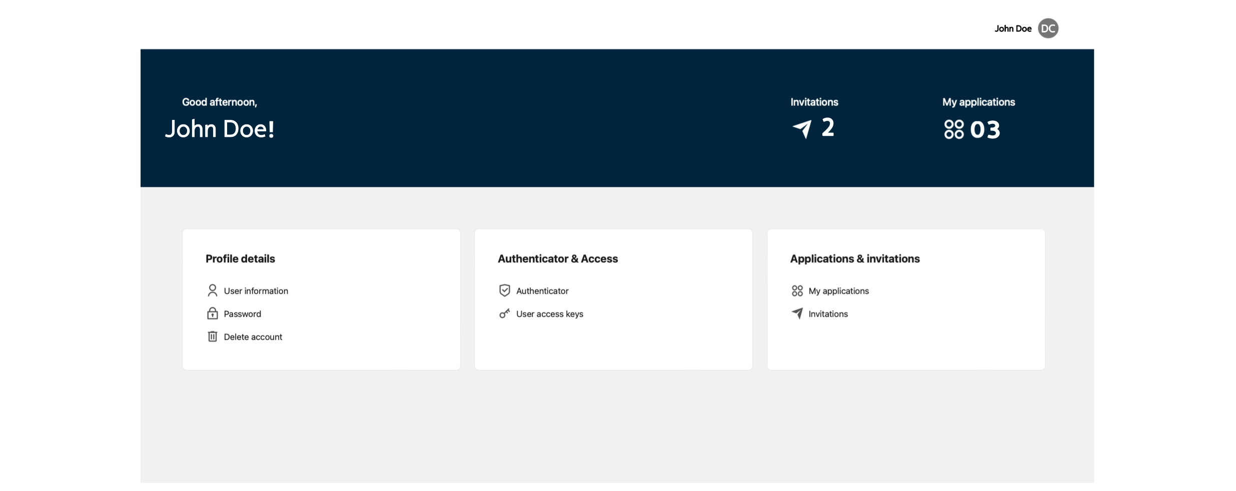 The Account Settings page is a centralized location where the logged-in user can view and update their profile details, authentication and access keys, as well as their applications and invitations.