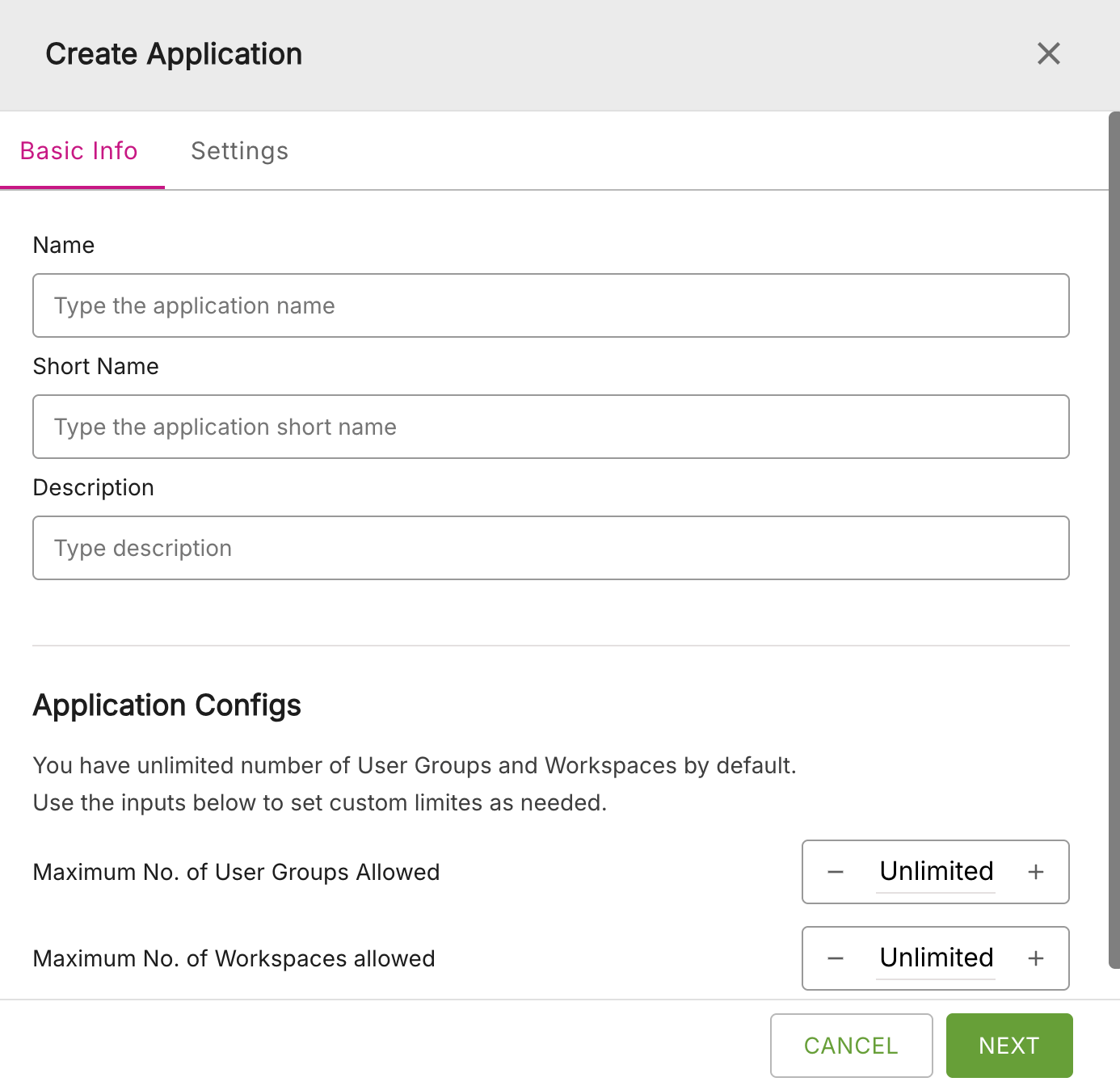 - The Create Application window will appear. Note that there are two tabs for listing application information: Basic Info and Settings. Enter the details for the Basic Info. Note that the Short Name provided must be unique across all applications.
