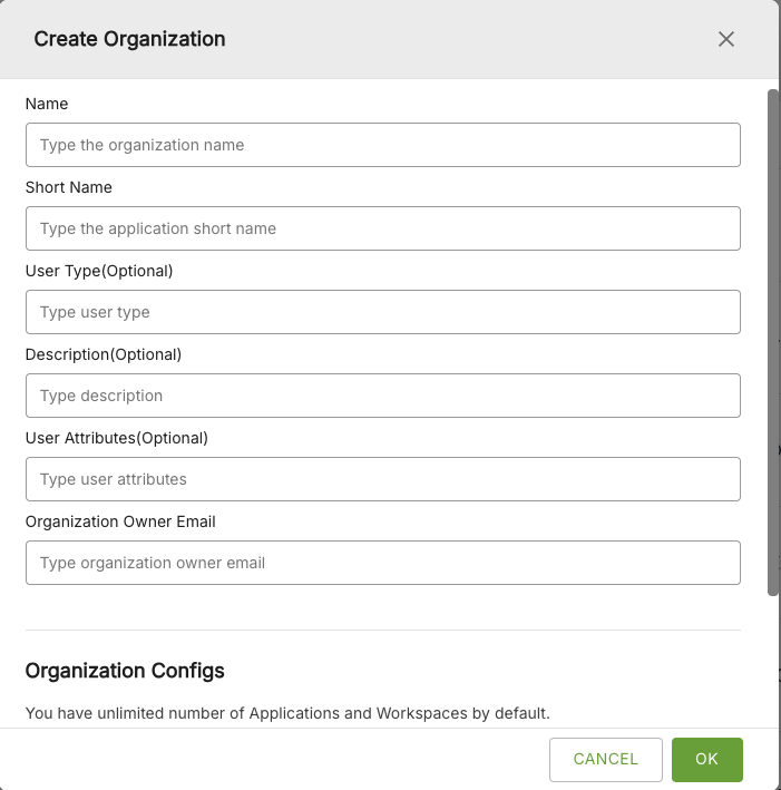 • Configure an Organization, where you can set details such as the maximum number of applications or workspaces allowed under a particular Organization.