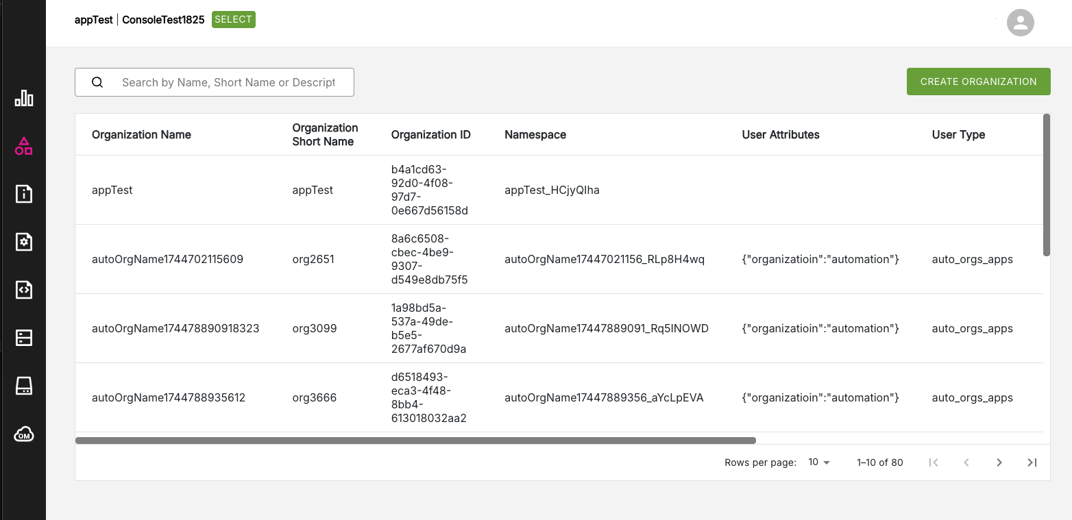 The Organization Management page is where you can perform a range of functions for managing organizations, depending on your Platform role, including: