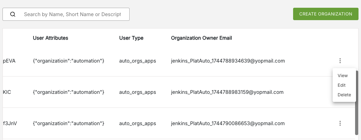 Depending on your Platform role, you can view and edit an Organization's details. This operations are accessible from the More Options menu which is available at the end of each row of an Organization listing. Scroll right along the row to reveal this menu option which will be visible as three dots to the right of the Organization Owner Email field.