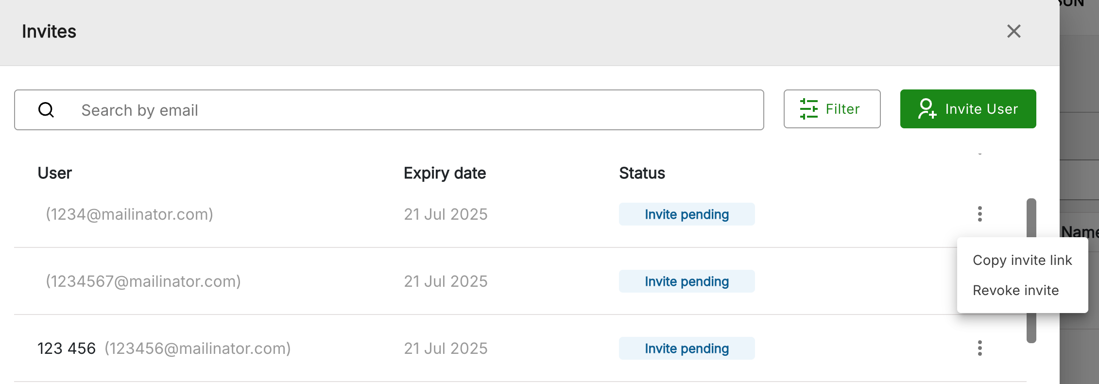 Note: For each new invitation listed, on the three-dot menu, you can now perform the actions: Copy invite link and Revoke invite.