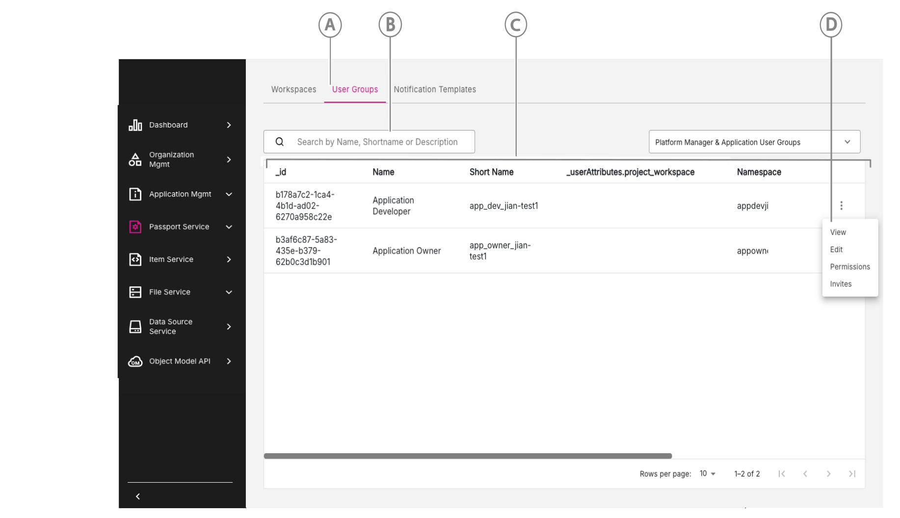 | D | Three-dot menu icon | Click to access other options where you can view, edit, or delete a user group from the user groups list, depending on your permissions. You can also manage permissions and invitations in the user group. For more detailed information, refer to the sections on Managing invitations and Managing Permissions below. |