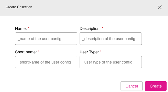 - The Create Collection dialog appears. Fill in the information for the fields: Name, Description, Short name, and User Type.
