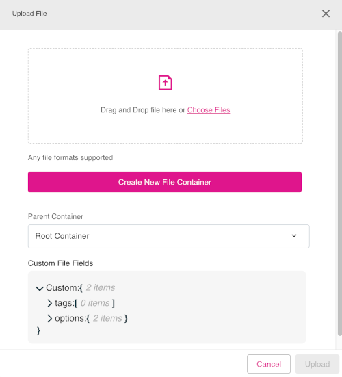 - The Upload File dialog will open. Add files by dragging and dropping files into the file upload area of the dialog. Alternatively, click Choose Files to manually add files.