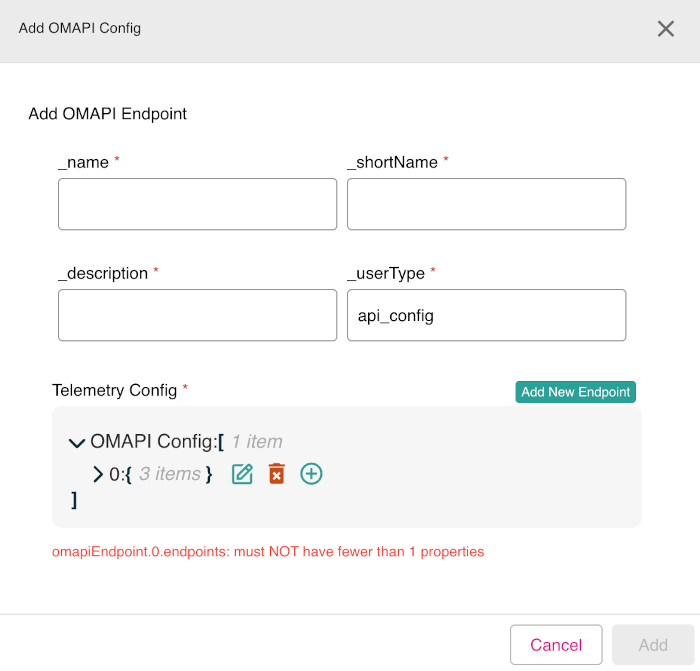 - The Add OMAPI Config dialog appears. In the section Add OMAPI Endpoint, enter the mandatory fields: _name, _shortName, _description, and _userType (by default, set to api_config).