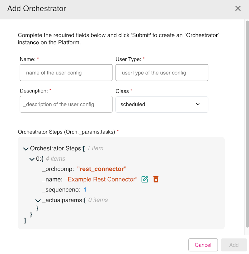- The Add Orchestrator dialog appears. Enter the mandatory fields: Name, User Type, and Description. Set the Class drop-down option to either scheduled (default) or instant.