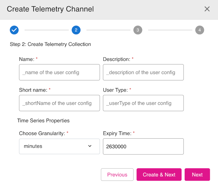 - In the Step 2: Create Telemetry Collection dialog, enter the required information into the mandatory fields: Name, Description, Short name, and User Type.